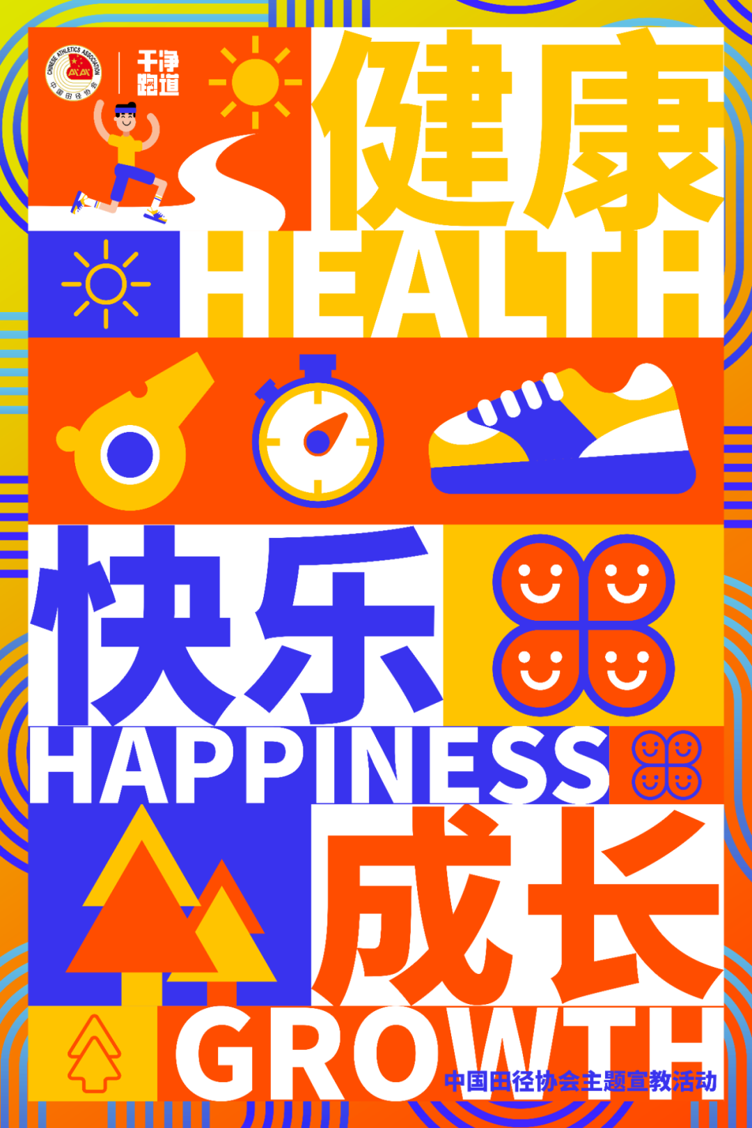 充满阳光气息的设计与色彩搭配,体现出“干净跑道”带给大众跑者、田径运动参与者的愉悦感,并借此传递“干净跑道”的内涵——享受健康快乐的田径运动,共同创造良好的运动环境,快乐生活,快乐运动。