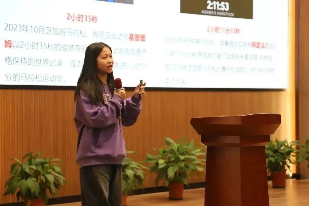 培训议程紧密围绕赛事介绍、志愿者工作内容与志愿者服务须知三大部分展开。首先,赛事介绍方面,本次青年志愿者负责人植丽敏详细讲解本次赛事基本信息、竞赛赛事日程、赛事路线图、选手号码布、指示牌、标识牌等马拉松赛事相关通识知识,有效增加了青年志愿者对本次赛事的了解,调动在场学生的赛事服务积极性。