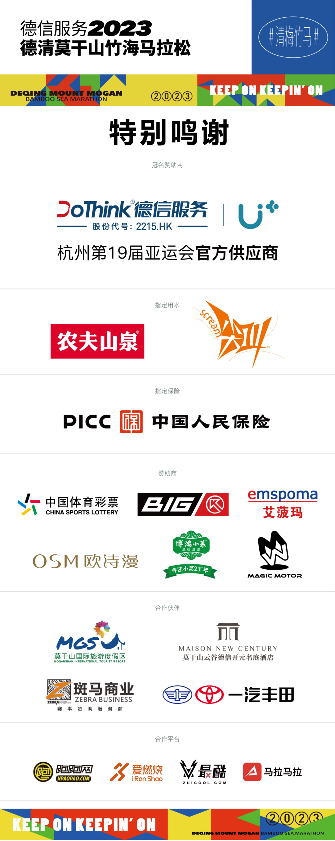 感谢冠名赞助商德信服务,赛事指定用水农夫山泉、尖叫,赛事指定保险中国人民保险,赛事指定用车一汽丰田,赛事赞助商中国体育彩票、瑞士大K运动服装、艾菠玛、欧诗漫、博鸿小菜、斑马商业、莫干山云谷德信开元名庭酒店对德清竹马提供了全方位的支持,你们的产品和服务、热情与关怀,都极大地保障并提升了赛事品质和赛事体验,期待未来继续携手合作。